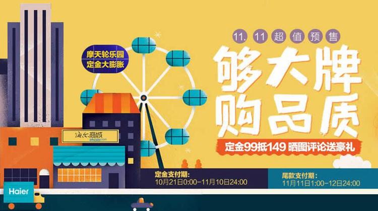 海爾11.11超值預售專場,定金大膨脹,全場商品支付99元定金尾款抵149元!套購滿5000元送價值299元料理機、滿10000元送399元吸塵器!搶先付定金,尾款最高立省300元!