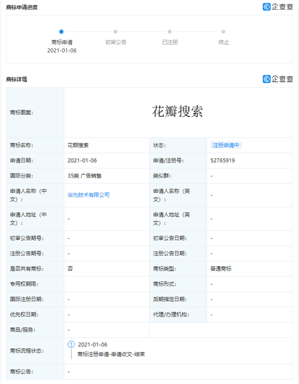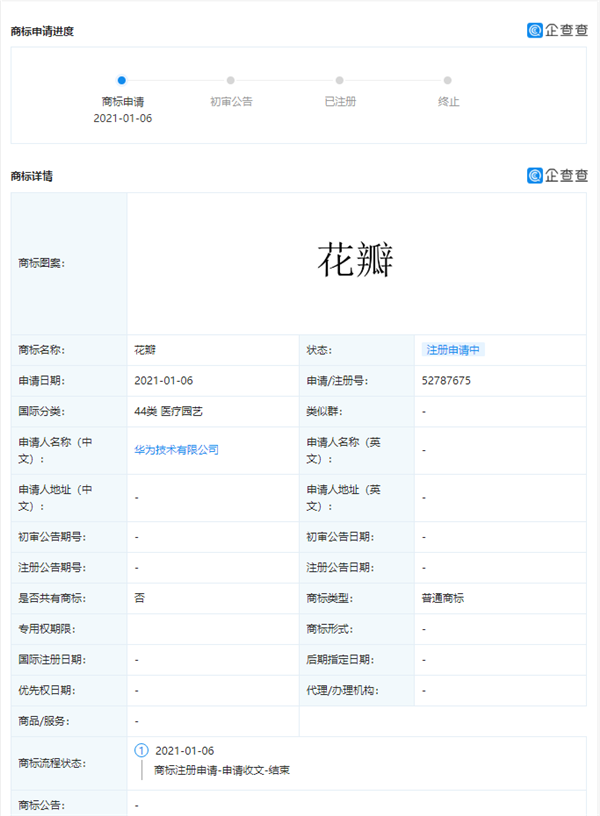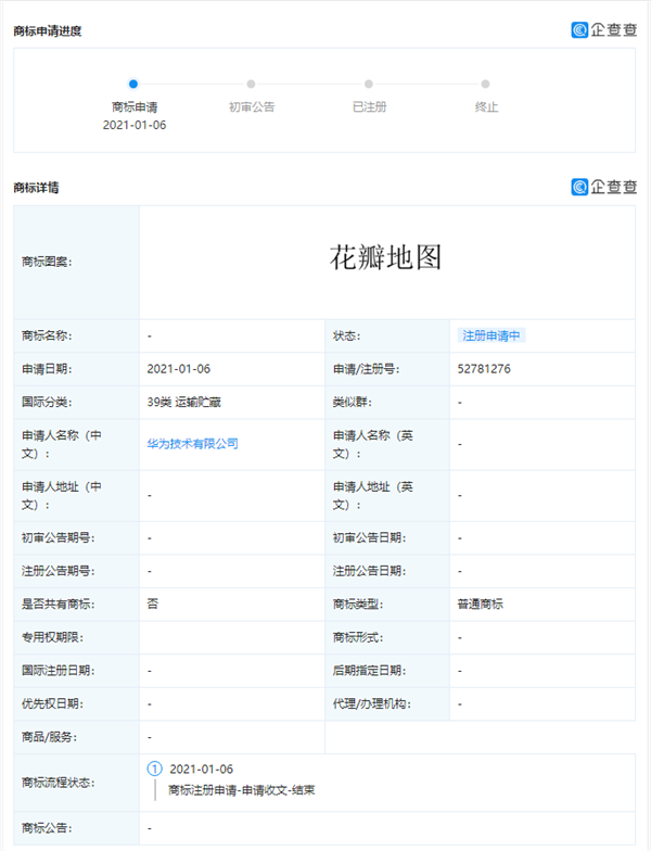 企查查APP顯示,近日,華為技術有限公司新增多條商標申請信息,商標包括“花瓣搜索”、“花瓣地圖”、“花瓣”等,國際分類涉及科學儀器、運輸貯藏等。